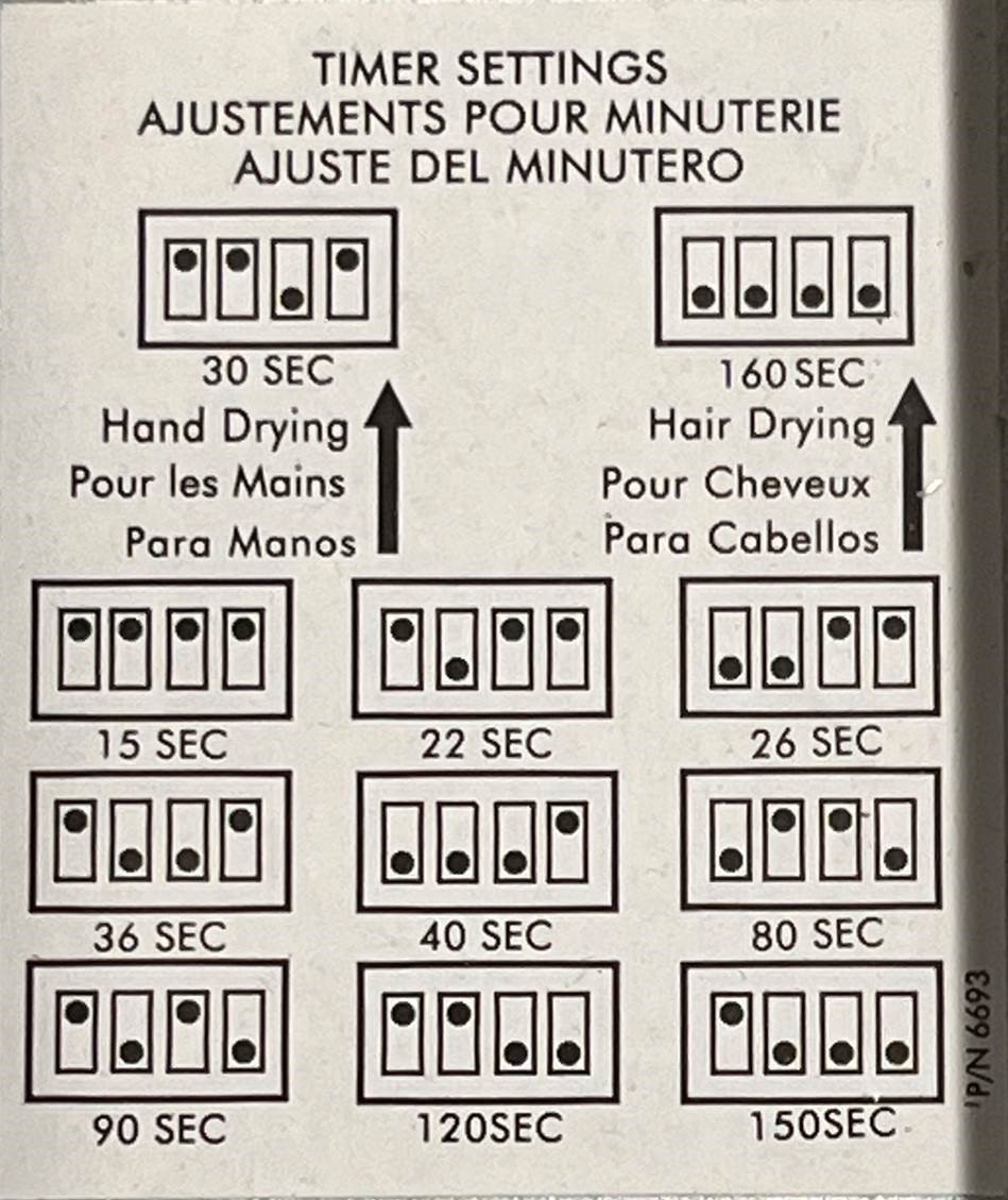 The settings for the timer dip switches are displayed on a label adhered to the dryer base. Also the service kit they received (55-055625K) should have included this same label in the kit. Please see attached.